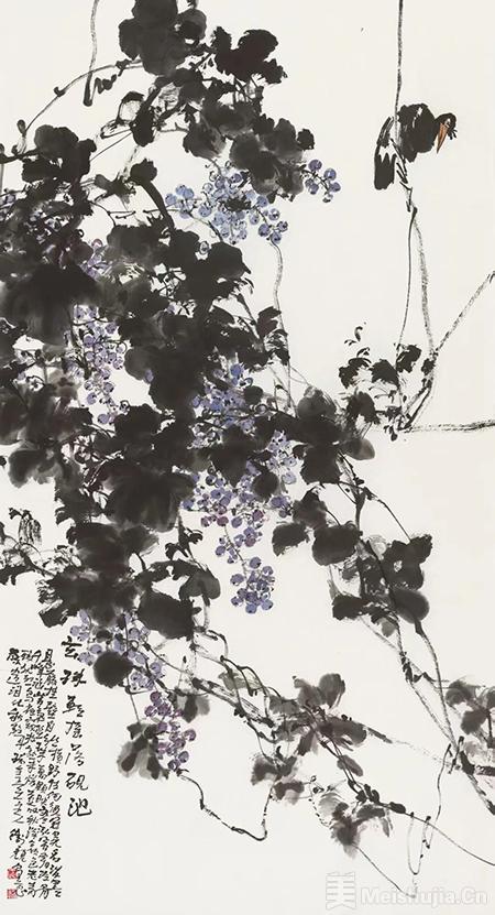 直到学画之始,我才知道徐青藤有《墨葡萄》留存于世且成为典范。“半生落魄已成翁,独立书斋啸晚风。笔底明珠无处卖,闲抛闲掷野藤中。”一片荒凉悲怆之气扑面而来,冷得发紧,紧得发苦,令人不寒而栗。画面中大面积的墨痕倒不像画,像是夜色凝成的泪,沉沉地、饱饱地垂着,仿佛下一刻便要坠下来,却又固执地悬在那里。葡萄乃点点墨珠而成,像是从黄昏的云霭里,或是从深夜的梦境中,偷来的一抹幽怨。青藤居士笔下的葡萄,让人感到饱蘸血泪的笔墨跃然纸上,甘甜中却充满了苦涩的味道。从这开始,葡萄在吴昌硕、齐白石等画家的笔下,已然从丰润华姿、晶莹欲滴转换为柔弱且倔强、孤独且无助了。葡萄带愁,愁的是时间的流逝与人生的不易,愁的是“鲜衣怒马少年郎”到“日暮东临大江哭”。