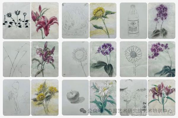 短短七日中,祁老师安排了篆书与勾线练习,带领我们从写生、拓稿、勾线到设色,最终完成一幅属于自己的原创作品。每一幅作品的诞生,都开启了学员们的艺术之门。大家亲身体验到生活中的美,随笔尖流淌,随色彩绽放。祁老师的课程严谨而生动,同学们孜孜不倦,乐在其中,既收获了知识,也滋养了心灵。