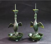 在“电气时代”尚未到来时,蜡烛曾陪伴人们度过无数个漫长的夜晚,伴随蜡烛而生的烛台,也成为古人托物言志的载体。武汉博物馆收藏的一对清代碧玉海晏河清烛台,均以整件碧玉雕琢而成。烛台上部为三层圆形蜡扦承盘,盘缘雕刻海浪纹、连珠纹。盘中的蜡扦下粗上尖,形如针锥,用于插放固定蜡烛。中部为一只站立的大雁,身形高大健硕,双目炯炯有神,头顶承盘,嘴衔宝珠,羽翼丰满,展翅欲飞。下部为洗式底座,盆状,下有三足。盆内高浮雕一龟,昂首作爬行状,形象逼真、动态十足,与绕身的蛇组合成玄武之像。底座外圈壁浮雕莲瓣纹饰,内壁刻海水纹。这对烛台取“雁”与“晏”的谐音,加上波涛汹涌的海水纹饰和水神玄武,传递了海晏河清的美好寓意。