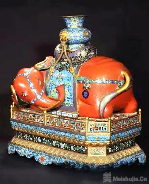 太平有象是中国传统吉祥纹样。象在古代是一种瑞兽,厚重稳行,能驮宝瓶,故有“太平有象”“喜象升平”之说。《汉书·王莽传》载:“天下太平,五谷成熟。”陆游也曾赋诗曰:“太平有象天人识,南陌东阡捣麦香。”吉祥图案常画象驮宝瓶,瓶中还插有花卉作装饰,代表天下太平、五谷丰登。清代景泰蓝太平有象,现藏于秦皇岛博物馆。这尊带座卧象姿态温顺,比例恰到好处,装饰华丽,造型精致细腻,展现出清代宫廷艺术的富丽堂皇和景泰蓝工艺的高超水平。其全身遍布金丝勾勒的毛发,黑白分明的眼睛,金灿灿、明晃晃的象牙,掐丝珐琅的金色尾巴,都让人叹为观止,象鼻卷曲处蓝绿黄三色心形纹如宝石镶嵌,象耳血管也以深蓝掐丝还原,更显工艺精湛。回字形褡子边纹,寓意连绵不断、吉利永长。以云纹为地、两侧纹饰飘扬的执扇,寓意风调雨顺、福寿安康。主图是口衔三线、系着珍珠的蝙蝠,寓意珍宝就在眼前。中间珍珠下挂磬形物,内饰花朵纹,寓意吉庆有余;磬两侧分别装饰三个灵芝如意头,寓意万事如意、好事连连。下绘海水和山石,寓意福如东海、寿比南山。