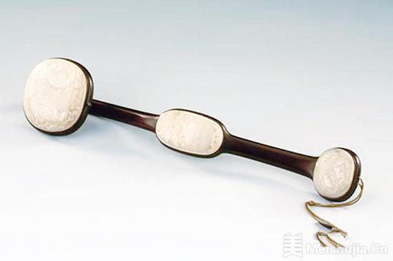 说起如意的起源,与我们日常生活中俗称“不求人”的搔痒工具——“搔杖”关系密切。最早的如意,柄端作手指之形,以示手所不能至,搔之可如意。如意由古代“搔杖”和记事用的“笏”演变而来,兼二者之用。后来,其形态发生分化,一支保留实用功能,在民间流传;另一支强调吉祥含义,向纯粹陈设珍玩演化。明清两代是如意发展的鼎盛期,集宫廷礼仪、民间往来、陈设赏玩等功能于一体。当如意和太平有象相结合,祈福吉祥之意加倍。沈阳故宫博物院藏有一件清代三镶玉象瓶纹如意,由紫檀木柄与三段和阗青玉镶嵌组合而成。上部玉件雕刻大象驮瓶花,象身肌肉线条分明,瓶体蕉叶纹清晰可见;中部玉件为蝙蝠造型,蝠翼舒展,托举宝瓶,象征福运延展,瓶身浮雕缠枝纹,整体构成“平安多福”寓意;下部玉件为卷毛狮子造型,狮鬃纹密不乱,狮口微张,呈喜庆状,暗含“喜庆吉祥”祝福。这件如意是清代权臣和珅专门为乾隆皇帝制作并进献的一件礼物,如意柄部背面雕制有隶书文字“御制”“西海永清武保定,南山为祝镇斯看”,文字内填金漆。署款“臣和珅敬书”,款下刻“和”“珅”篆书连珠方印。此物作为宫廷旧藏得以保存,实证了和珅与乾隆密切的君臣关系。