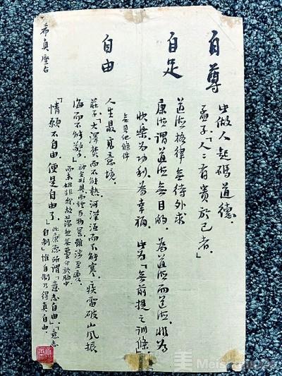 自尊:此做人起码道德。孟子曰:“人人有贵于己者。”自足:道德格律无待外求。康德谓,道德无目的,为道德而道德。非为快乐,为功利,为幸福。此为“无前提之训条”。无其他条件。自由:人生最高意境。庄子:“大泽焚而不能热,河汉冱而不能寒,疾雷破山风振海而不能惊。”神全形具而体与物冥,虽涉至变而未始非我,故荡然无虿介于胸中。“情愿不自由,便是自由了。”此康德所谓“意志自由”。“意志自制”惟制乃得真自由。希真座右。