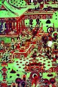 据考,莫高窟四百九十二个存在壁画和塑像的洞窟里,多数都有青绿。在一千多年的营建历程中,每一个朝代的洞窟也大都有青绿,尤以唐代最盛。著名的254窟(北魏)《萨埵太子本生图》和257窟(北魏)《九色鹿王本生图》,山峦、树林、流水、建筑及人物飘带,都是美丽的青绿色彩;217窟(盛唐)《佛顶尊胜陀罗尼经变图》,则是典型的李思训式青绿山水;172窟和45窟(盛唐)《观无量寿经变图》中的反弹琵琶,在绝美的动态间,用青绿色彩画出飘逸的舞带,使整个画面有了华彩炫目、飞扬灵动的效果。众多洞窟里动态优美、形象生动的飞天,其流畅飘逸的彩带和图案,也大都以青绿描绘。《五台山图》(五代)这幅莫高窟现存最大的壁画,在展现精美建筑的同时,亦用青绿色彩描绘了五台山的山山水水和民间风情。至于众多洞窟中数不清的千佛图,更是青绿频出。
