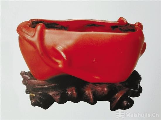 柿,又称“果中圣品”“丹果”等,其故乡在中国,约有三千余年的栽培历史,《上林赋》中已有“枇杷橪柿”的记载。唐代,“教民种柿”蔚然成风。柿有许多优秀的品性,人们将其与“德”字联系在一起,如唐代段成式在《酉阳杂俎》中称“柿有七德”:一多寿,二多荫,三无鸟巢,四无虫,五霜叶可观,六佳品可啖,七落叶肥大,可以临书。由于“柿”与“事”谐音,有寓事事如意。于是,民间视柿子为吉祥之果,以图个吉利。此件珊瑚红杮子式水丞,作为文房用具,给案头陈设平添雅趣,同时还带来“柿柿”如意的彩头。