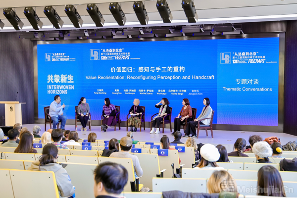 随后专题对谈以“价值回归:感知与手工的重构”为主题,黄燕、约西·阿纳亚(Yosi Anaya,墨西哥)、玛丽卡·萨拉兹(Marika Szaraz,卢森堡)、吴化雨、乌尔丽卡·贝尔格(Ulrika Berge,瑞典)、金钟玉(Jongock kim,韩国)等嘉宾围绕“‘数字冷感’与手工温度的再平衡”“纤维工艺性的当代转译:从手作到跨媒介实践”等议题展开讨论。