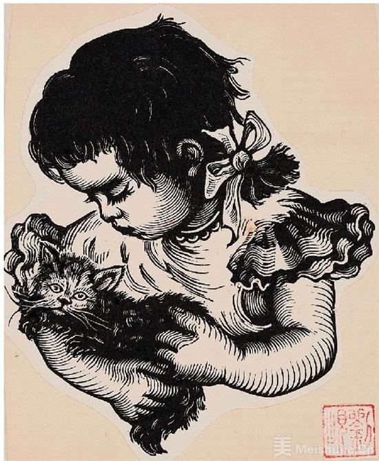 刘岘 我爱我猫 10×8cm 木口木刻 1960年 浙江美术馆藏