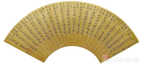 近于“至扇至美:上海博物馆藏历代扇面书画名品展”,见萧云从金笺扇面《楷书自作诗(七律)四首》,乃萧云从57岁时所书,行笔点画圆劲含蓄,书风清逸雅秀也。