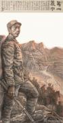 《万山丛中》的表现对象是陕西籍抗战名将包森,他于延安抗日军政大学毕业后赴晋察冀根据地工作,后升任晋东军区副司令。他率部转战黄河两岸攻坚克敌,威震晋东,叶剑英元帅称其为“中国的夏伯阳”。这幅作品没有正面描绘激烈战斗的场景,而是撷取了著名的1940年盘山门草洼战斗中,全歼日寇骑兵中队后的胜利瞬间。这是一种“去戏剧化”的叙事策略。画中的包森侧面全身肖像占据了近一半的画面,他手持步枪、脚踏着敌寇的旗帜,腰挎缴获日寇的“王八盒子”,矗立于黄河岸边,远处是缴获来的武器弹药与打扫战场的战士们。人物顶天立地式的设计凸显了抗战英雄的伟岸,通过坚毅及对敌仇视与蔑视的眼神等细节的刻画,画家塑造了抗战英雄的自信与从容,有“泰山崩于前”而色不变的镇定,突出了民族脊梁的坚强与果敢。同时,画家对于主体人物肖像的描绘采用了中西融合之后的当代中国画语言,笔触线面的塑造,渴笔皴擦的造型以及明暗表现,使人物形象厚重坚实近乎雕塑。