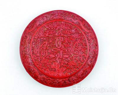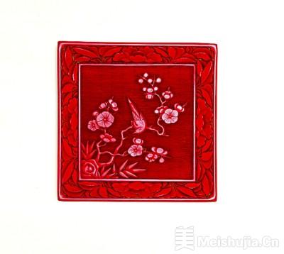 故宫博物院藏明代剔红梅竹寒鹊图方盘,通体髹朱漆,盘心在天锦地上压雕花鸟图案,左下竹石遒劲。婀娜多姿的折枝之上,梅花争奇斗艳,清秀高雅,一只喜鹊引颈逗梅,寓意“喜上眉梢”,呈现出一幅生动的隆冬之景。画面以横线锦文作地表现天空,四边各雕朱漆茶花花叶,间隙中还可以看见黄色的素漆地。