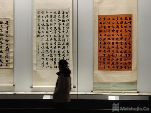 在特别呈现板块中,展览系统梳理了王懿荣旧藏1500余片甲骨的流转轨迹,展出了青铜器全形拓等,再现其“上自夏商,下至唐宋”的金石收藏视野。其题赠友人的团扇论艺墨迹,展览设计墙中月亮造型为视觉载体,彰显其“重意轻法”的诗画创作理念。