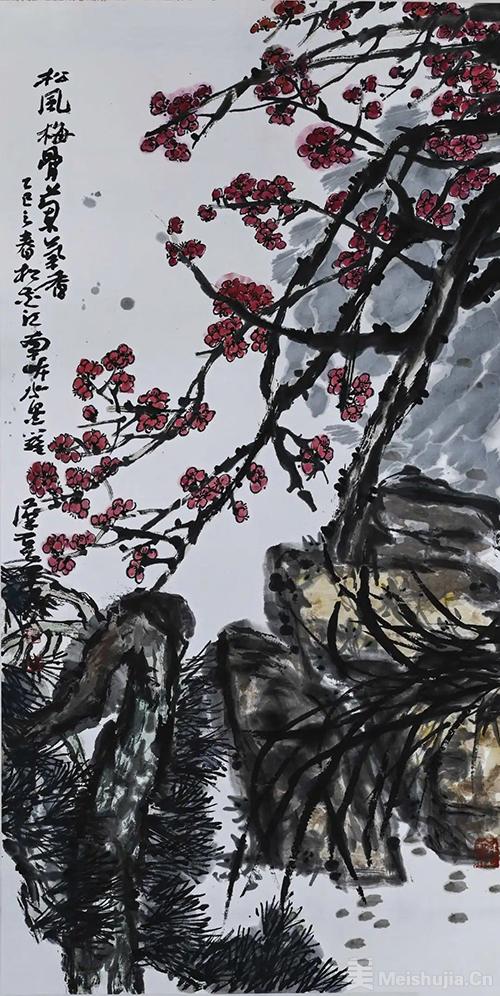 这种金石气的灌注,首先是对“线”之生命意志的重塑。线为中国画之骨。石正军摒弃了花鸟画中习见的灵巧游丝或飘逸兰叶,转而向商周金文、秦汉刻石的洪荒之力求索。他画梅枝,取法“石鼓文”之精髓。观其《寒香凝铁》中老干,线条苍茫如百炼钢,却内含崩而不溃、引而不发的内在张力。行笔如“锥画沙”,力透纸背,笔锋铺展处,线条中段饱满如鼓,两端含蓄如桩,将寒梅在苦厄中砥砺出的生命力,凝固为一种近乎抽象、带有几何庄严感的刚健架构。这不再是描摹风中之姿的“线”,而是承载着时间重量与物质韧性的“脊梁”。