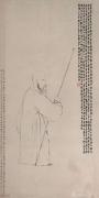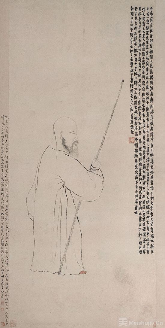 仔细品读金农的《自画像》,会发现其中蕴含着他全部的艺术哲学。画家以渴笔焦墨勾勒人物形象,线条生拙简朴,脱胎于南宋马和之的“兰叶描”。人物的头部描绘写实,长髯、发辫、双目皆细致传神,展现出金农奇倔傲世的性格;而身体部分却极尽夸张,近乎漫画造型,这是文人画家“逸笔”的自觉追求。最微妙的是,老者右足微露红鞋一角,这一细节被后世解读为“踏破红尘”的意象,成为其超然人生态度的点睛之笔。画中的题款采用典型的写经体楷书“长题”,与画像本身共同构建出拙朴奇绝的视觉整体。这幅作品不仅是对容貌的记录,更是一份关于自我身份与艺术追求的深刻宣言。
